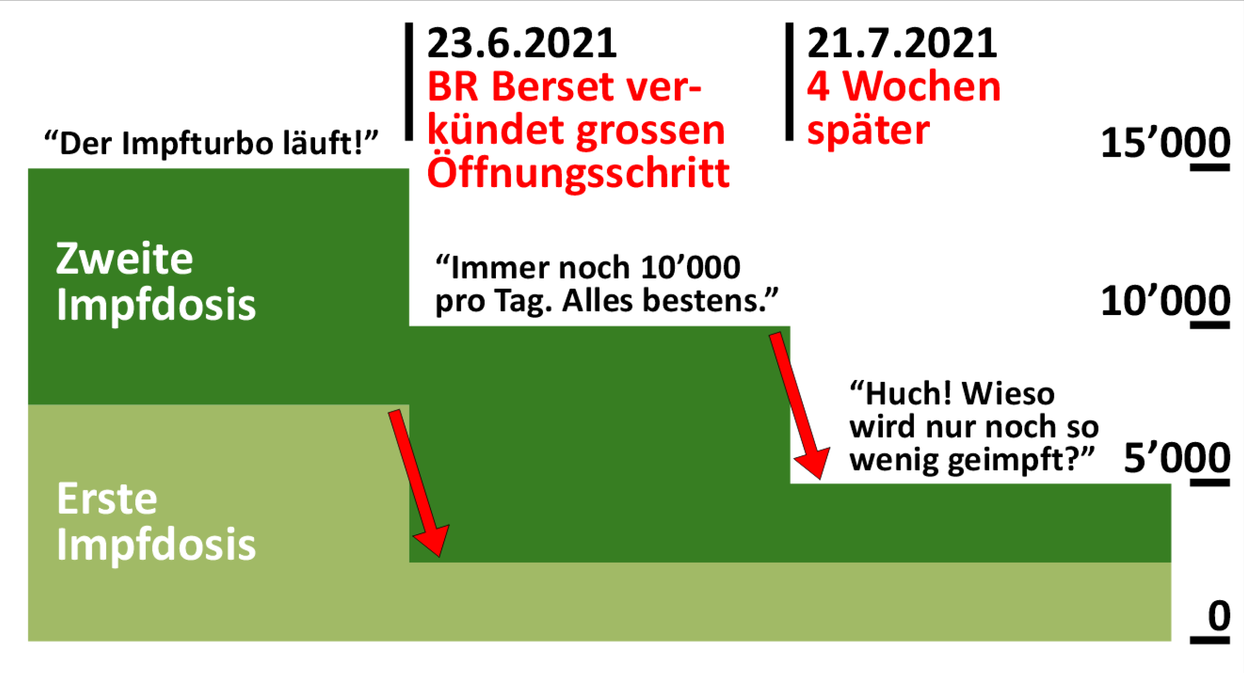 Die Ursache für den «Impf-Knick» ist klar: Er fällt genau zusammen mit der Pressekonferenz, an der Bundesrat Berset den neuesten grossen Öffnungsschritt verkündigt hat. Dieser vermittelt das falsche Signal, eine Impfung sei nicht mehr nötig. Ein leichter Rückgang bei den Erstimpfungen beginnt, als ein paar Tage vor der Pressekonferenz die Medien über die geplanten Details berichten. Der deutliche Rückgang zeigt sich dann in den Zahlen am Tag nach der Pressekonferenz. Vier Wochen später zeigen sich die tiefen Erstimpfungen auch in tiefen Zweitimpfungen. Die Impfzahlen sind endgültig zusammengebrochen.
