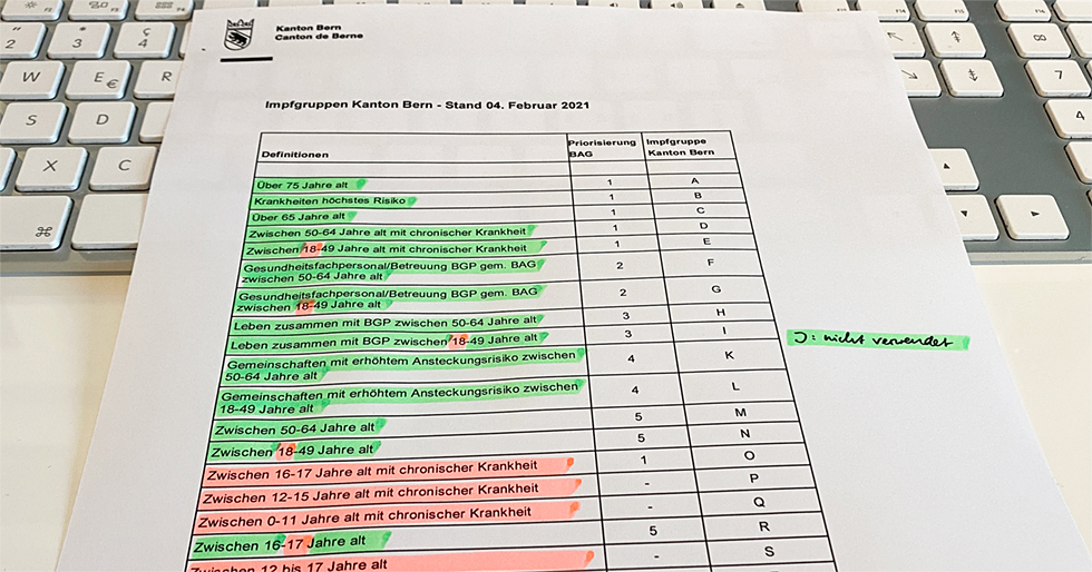 Die Impfgruppen sind kein Staatsgeheimnis mehr! Dank über 800 Meldungen aus der Berner Bevölkerung habe ich den «Buchstabensalat» entschlüsselt, um für mehr Transparenz und damit für ein besseres Verständnis in der Bevölkerung zu sorgen. Gleichzeitig habe ich durch ein formelles Gesuch um Akteneinsicht den Kanton zur Bekanntgabe gebracht. Es ist ein Sieg für die Transparenz.
